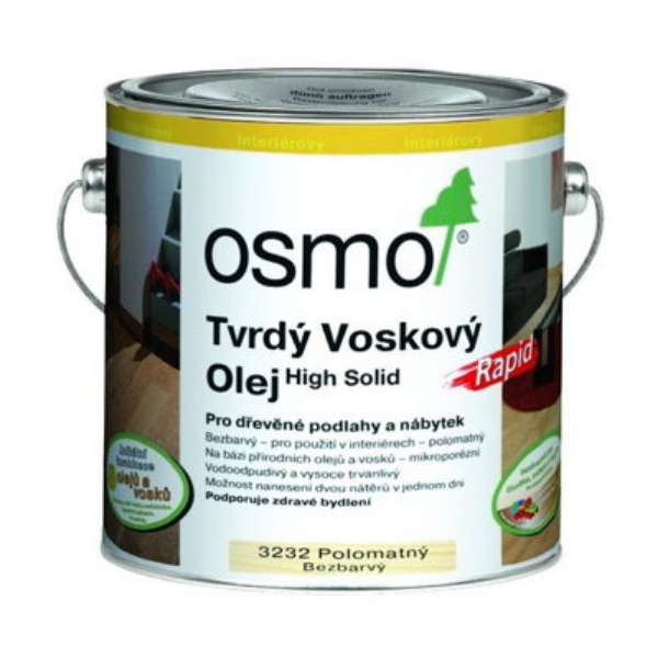 Je rýchloschnúci náter na podlahy so špeciálnou povrchovou tvrdosťou, ktorý jedinečne kombinuje výhody prírodných olejov a voskov v jednom výrobku. Osmo Tvrdý voskový olej Rapid je vodoodpudivý a oderu odolný a vytvára na dotyk príjemný povrch. Jednoduchá aplikácia bez základovania a medzi brúsenia šetrí čas aj peniaze. Vhodný pre drevo s otvorenými pórmi, nepraská, neodlupuje sa. Odpudzuje vodu, nenáchylný k zašpineniu, odolný proti ošľapávaniu. Osmo Tvrdý voskový olej Rapid je odolný voči vínu, pivu, kolovým nápojom, káve, čaji, ovocnej šťave, mlieku, vode. Suchý povrch je bezpečný pre ľudí, zvieratá a rastliny.