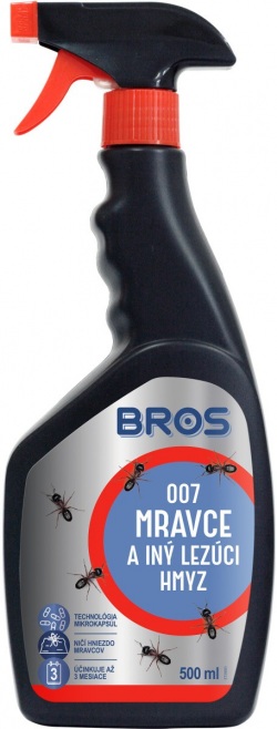 BROS Sprej 007 na mravce a iný lezúci hmyz 500 ml je tekutý prostriedok s mikrokapsulami na likvidáciu mravcov a iného lezúceho hmyzu v exteriéri a interiéri.