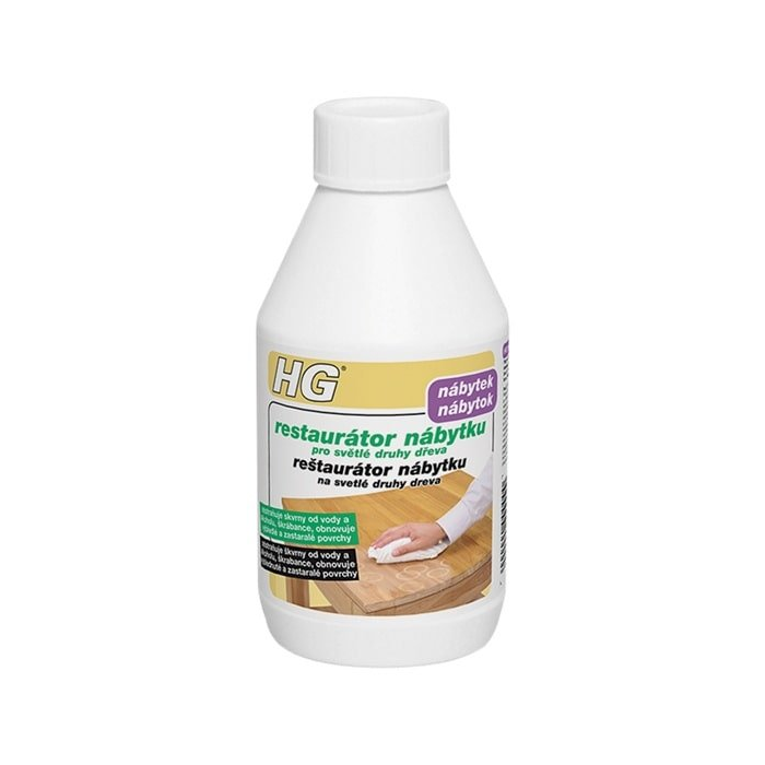 Prípravok HG reštaurátor nábytku na svetlé druhy dreva je vysoko kvalitný ošetrující prípravok na morený, olejovaný, voskovaný alebo inak ošetrený nábytok z nelakovaného dreva, ako napríklad z borovice. Škvrny od tekutín ako sú napríklad kruhy od vody a alkoholu zmiznú, zašednuté a vyblednuté povrchy získajú späť svoju prirodzenú farbu, škrabance budú zamaskované.